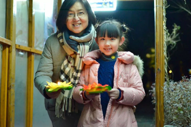 与家人一起点燃手中的荷花灯