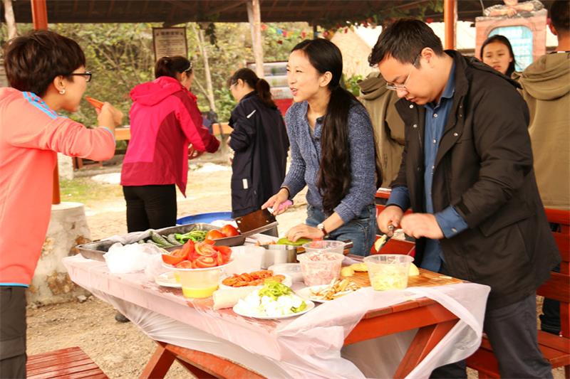 1.大锅灶自己动手烧菜。严格按照指示,控制就餐容量,长条桌同排隔位相坐;分餐制、用公勺公筷。