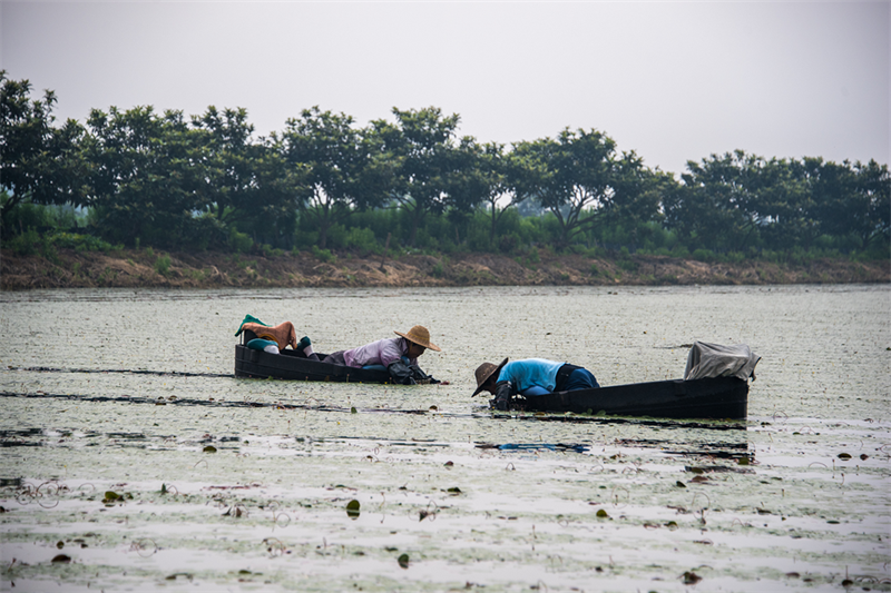 太湖莼菜的嫩叶均躲藏在水面30㎝以下,采摘莼菜时,需趴在菱桶里,双手划水,交替采摘。莼菜的茎叶十分脆弱,需要一针针、一叶叶地细心采摘。